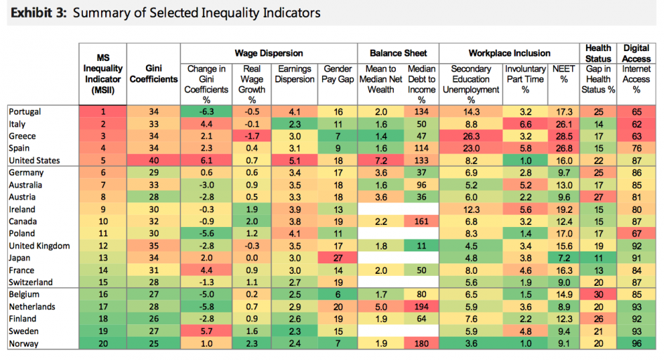 Le 77 pagine piene di numeri e frutto di un lavoro di molti analisti ed economisti ci dicono almeno due cose: nell’Ocse, i Paesi del Sud Europa sono i più diseguali di tutti, con Portogallo in testa seguito da Italia, Grecia e Spagna e quella negli Stati Uniti tocca livelli molto simili; gli investitori – che sono quelli a cui il rapporto è rivolto – dovrebbero preoccuparsi di tali diseguaglianze perché minano la crescita e rendono i mercati e le economie più insicure. E minano la democrazia, con tutte le conseguenze economiche del caso.