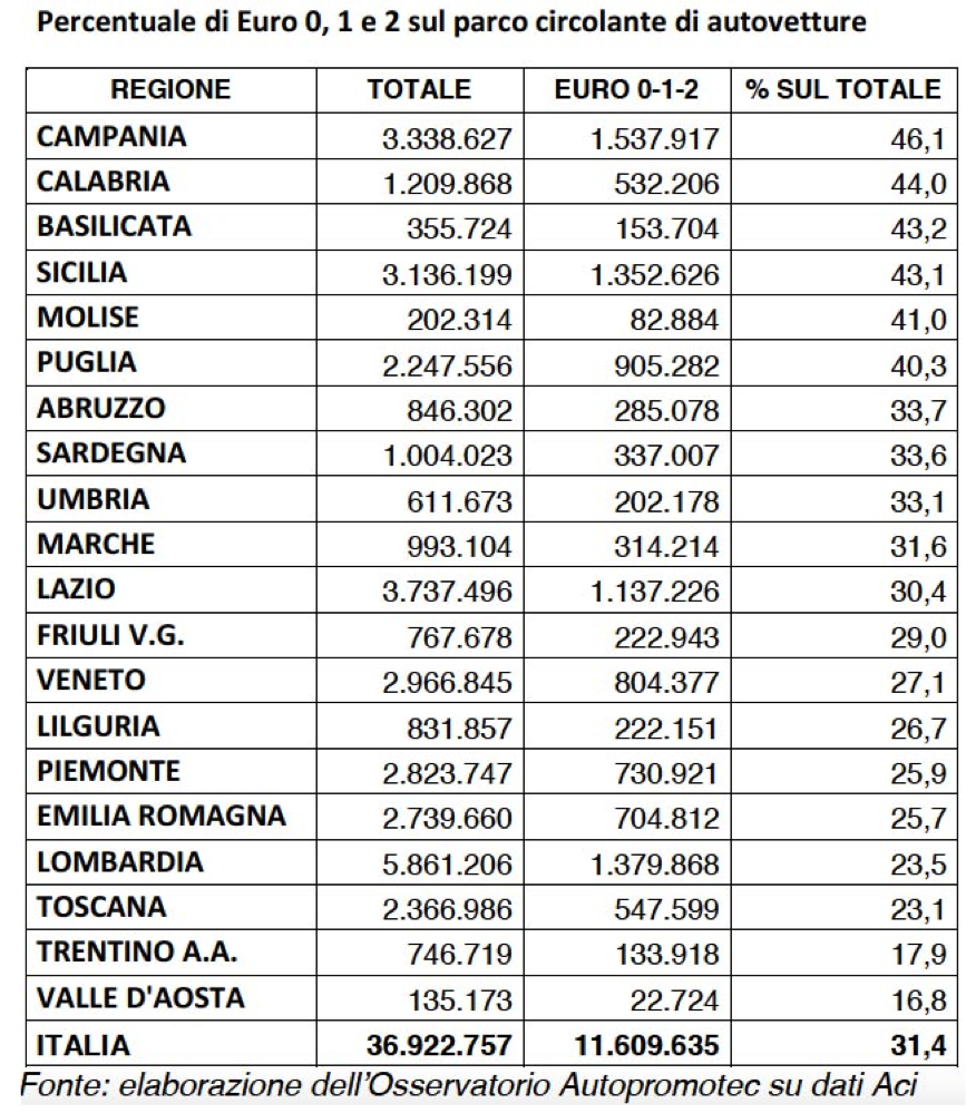In realtà, a fianco di interventi, tutti sensati, per l’incremento e la maggiore efficienza del servizio pubblico locale (come più metropolitane e autobus più moderni), il tema dell’età media del parco auto circolante può essere affrontato rapidamente con costi probabilmente non proibitivi. Su 36 milioni di vetture circolanti, 11 milioni sono Euro 0, 1 o 2, oltre il 30 per cento, con punte che superano il 40 per cento nel Mezzogiorno (tabella 1). Senza uno svecchiamento radicale, le probabilità di riuscire a incidere realmente sui livelli di inquinamento delle nostre città sono pari a zero. Si potrebbe ad esempio riflettere su un bollo di circolazione il cui importo, a parità di cilindrata, aumentasse con la vetustà dell’auto: più la macchina è vecchia, più si paga.