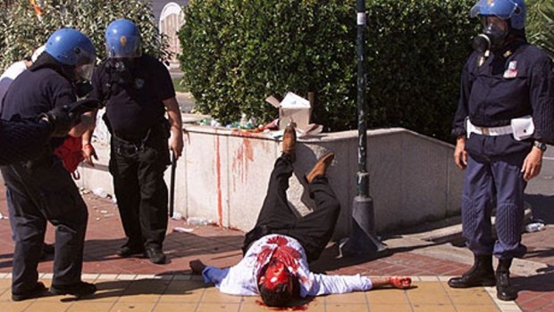 Maschere di sangue che urlavano disperati e terrorizzati. Il sangue era ovunque! sui muri, sui pavimenti, sui vetri delle finestre… sulle porte. Le immagini sull’abuso di potere e sulle violenze ai danni dei manifestanti sono note in tutto il mondo! Il governo italiano ha costruito attorno alla manifestazione un pesante clima di terrore e di torture. Nonostante la presenza di oltre 300 mila persone quel che resta di quei giorni è un processo a pochi sfortunati e il silenzio di gran parte del movimento. L’amara conclusione della mattanza di Genova conta 1 morto, 1200 feriti, 450 persone al pronto soccorso… 6200 lacrimogeni usati!